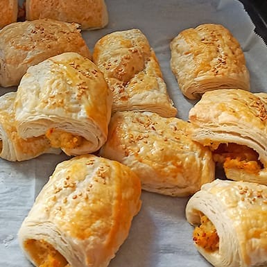 Crispy, golden puff pastry rolls filled with a savory mashed potato and onion mixture. An easy and delicious appetizer or snack using frozen puff pastry.